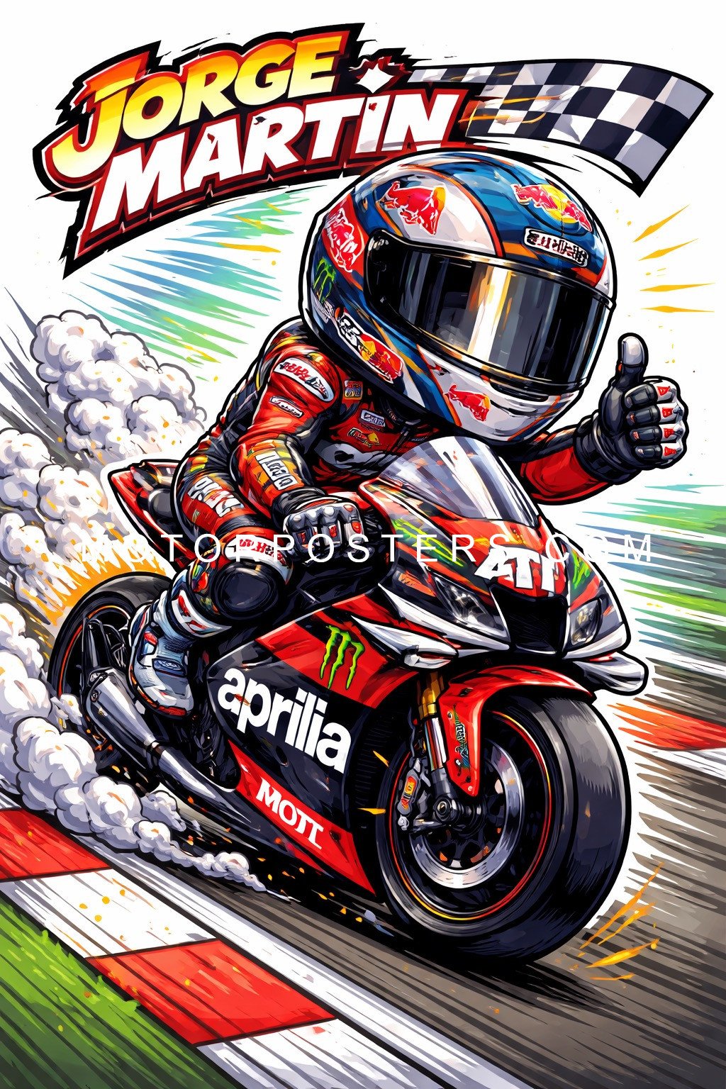 Crafted with finesse, this cartoon image captures the essence of Jorge Martin’s character in a fun and approachable style. The vibrant colors and distinct features make it a standout piece that’s easy to fall in love with. From the details in his expression to the bold lines that outline the artwork, every aspect of the image is designed to leave a lasting impression. This illustration embodies the thrill, energy, and charisma of Jorge Martin in a way that’s both modern and timeless.