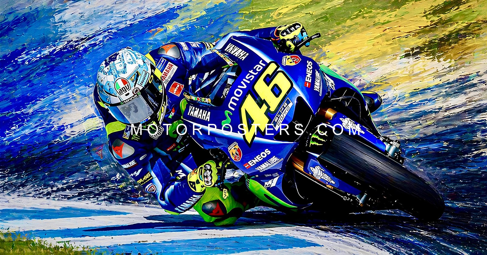 Bring the energy of the racetrack into your space with this A2 polyester cotton poster of Valentino Rossi. Featuring a high-quality print of the master motorcyclist, this poster is perfect for fans and enthusiasts alike.