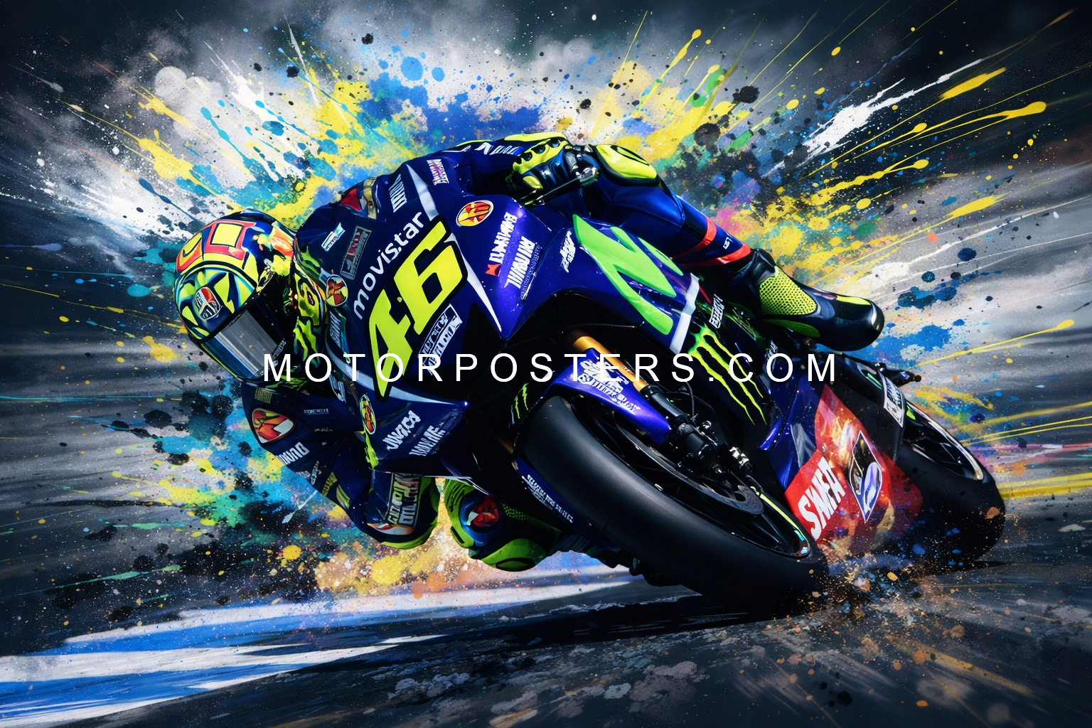 Bring the energy and charisma of the motorcycling icon to your space with this stunning Valentino Rossi A2 poster. Crafted to perfection, this piece is designed to inspire and captivate fans of the legendary rider.