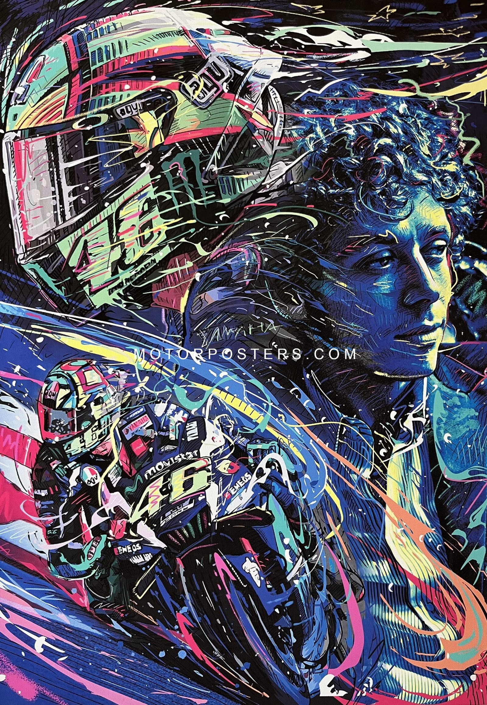 Perfect for your home, office, garage, or studio, this poster is a tribute to Rossi’s iconic journey and his number 46. Add this powerful piece to your collection and let your walls speak volumes about your passion for racing.