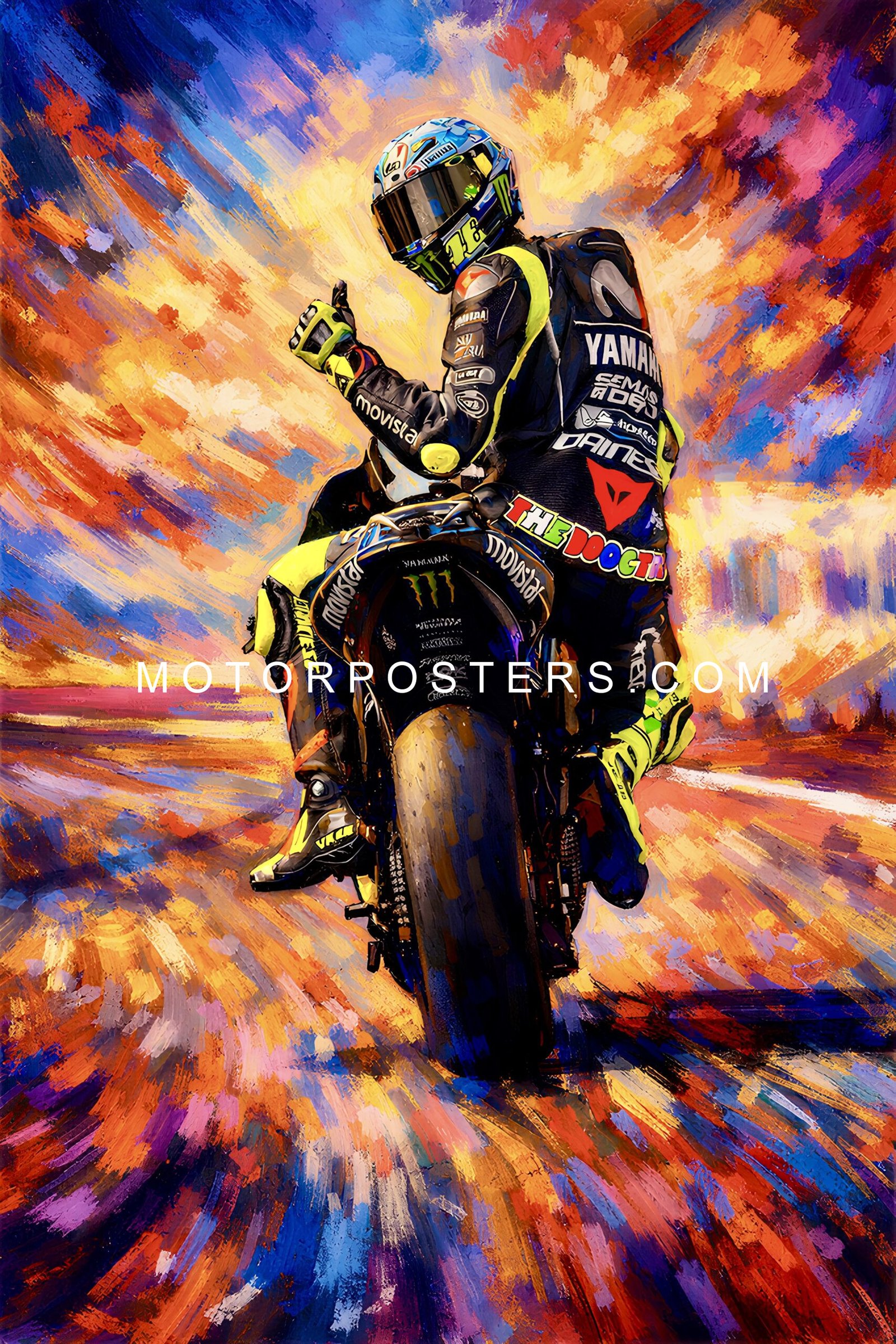 Bring home the thrill of the racetrack with this premium A2 polyester cotton image of Valentino Rossi. Perfect for fans and collectors alike, this high-quality print captures the legendary rider in all his glory, adding a bold statement to any space.